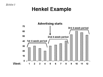 Most recently, the ARS Group documented the short-term effects of advertising on scanner sales, also demonstrating the wearout, or diminishing returns, phenomenon. (See Exhibit 2.) The largest effect is seen in the first four-week period after airing. In period two the effects immediately begin to decline, and in periods four and five the ads are not even maintaining the levels achieved when they first went to air. Henkel has verified this wearout and diminishing returns principle or law and is using it for ongoing advertising investment decisions. As shown in Exhibit 3, the advertising starts, and the largest bump is in the next four weeks. As you can see, the effects begin to diminish in weeks 11 and 12 as the ad is wearing out.