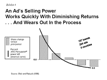 As was shown in Exhibit 2, an ARS Group study of wearout in scanner sales demonstrated that an execution’s selling power works quickly with diminishing returns. These diminishing returns seen in market performance have also been observed in the wearout of ARS Persuasion scores as the executions are aired. (See Exhibit 4.) Due to this predictable decline in sales-effectiveness, it is essential and practical to refresh the executions on a systematic basis.