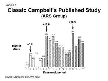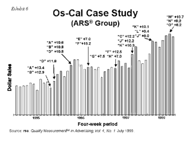 The first example of a practitioner using this approach is the classic Campbell’s study published in the March/April 1992 issue of the Journal of Advertising Research . In this study you see effective advertising bringing about an immediate bump in share, then declining market share as the ad wears out. When the execution is refreshed with another persuasive ad, the cycle starts again, then again. Note that at the end of each period of airing, share remains at a higher level than before. (See Exhibit 5.) The more recent published Os-Cal case study provides another clear example . . . air, refresh, air, refresh. . . continuing to build brand preference, sales, and market share over time. (See Exhibit 6.)