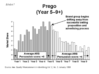 Over the next four years, the Prego brand group drifted away from its successful selling proposition and advertising process. Prego’s average ARS Persuasion level dropped to +4, only half of what it had been achieving during the successful five-year period. Share also declined, nearly reaching a nine-year low. (See Exhibit 7.)