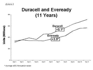 2. Duracell batteries: During the 11-year study, both Duracell and Eveready grew, but Duracell managed to take over and fortify the number-one spot, fueled by more persuasive advertising (an average ARS Persuasion level of +5.1, versus Eveready’s lower persuasiveness of +3.9). (See Exhibit 8.)
