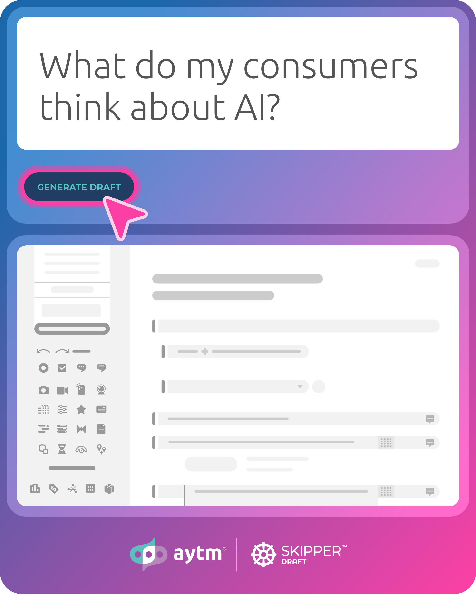 Great research starts with the right questions – and now it starts faster. Skipper Draft, aytm's AI research assistant, turns your objective into a methodology-grounded survey draft in seconds. Built on years of research expertise, it gives your whole team the ability to design and launch better surveys: