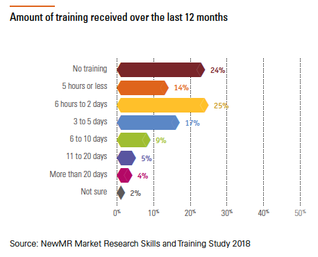 Ray Poynter and Sue York at NewMR recently ran a survey designed to answer the questions, “How much training do market researchers receive, and is it enough?” They interviewed just over 1,100 researchers (corporate and supplier-side) in 59 different countries. A full report is available at http://bit.ly/NewMR18.