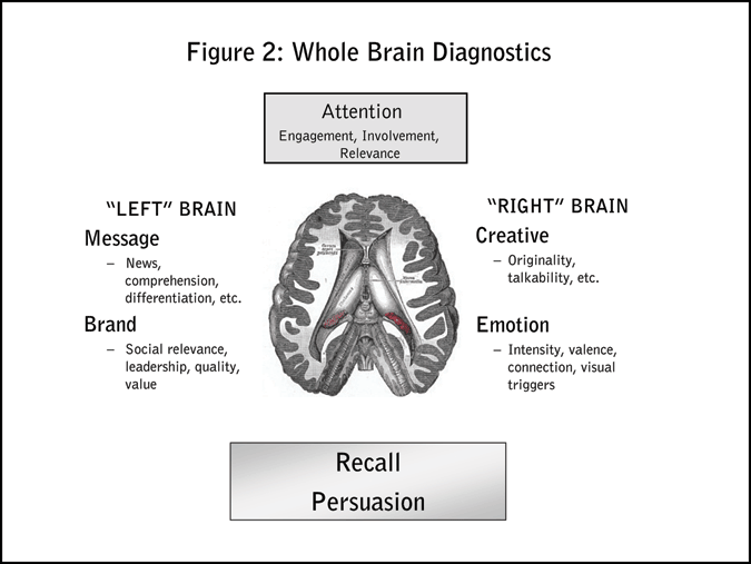 Our Whole Brain Diagnostic Suite was designed to render a clear picture of how viewers respond to a test ad on emotional as well as rational levels. The system provides feedback both about how deeply the ad is processed and about how key mental modalities are engaged by the ad (Figure 2).