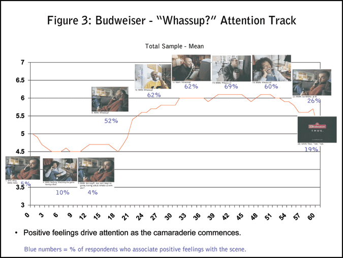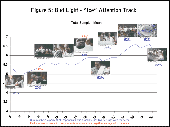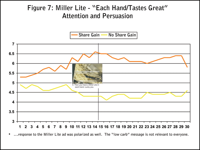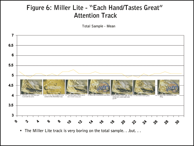 In case you were wondering if all ads show this generally upward pattern of increasing attention, there’s the Miller Lite case. This ad was selected because its approach was primarily rational and not emotional. Not surprisingly, the Attention Trak for the Miller Lite ad is essentially flat (Figure 6).