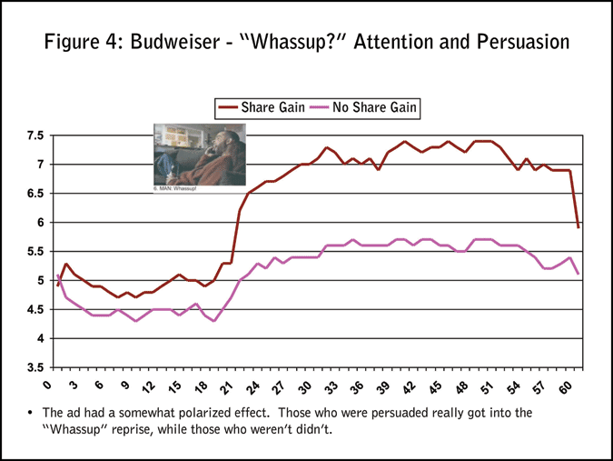 Interestingly, “Whassup” produced a bimodal response (Figure 4). There were those who got into it - the ad made that personal connection - and those who did not. We saw clear differences in the depth of processing among those who were “persuaded” by the ad to allocate a greater share of drinking occasions to Budweiser versus those who were not “persuaded.”