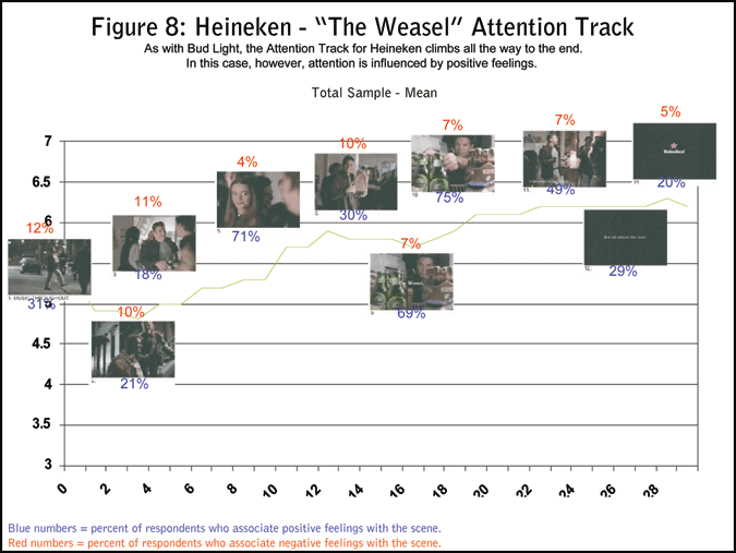 Once again however, it pays to look beneath the surface (Figure 7). This “low carbs/great taste”-focused ad produced a polarized response, finding its mark only among those guys looking to lose their love handles yet keep their world-class beer. The rest of your typical 21-35-year-old beer drinkers couldn’t have cared less. You can be sure that Miller has something else in mind to capture the other guys...as did Heineken with its classic, guy-beer-girl, formula (Figure 8). Notice how the scenes associated with a positive emotional response are also associated with increased attention and engagement with the ad.
