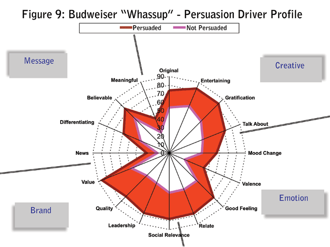 The payoff comes in the Brand quadrant - the thickest band and source of the ad’s selling power (Figure 9). The viewing experience is not only positive and rewarding it is connected to the brand. The brand plays a central role in this wonderfully engaging “life is good” story: havin’ a Bud; life is good; true, true.