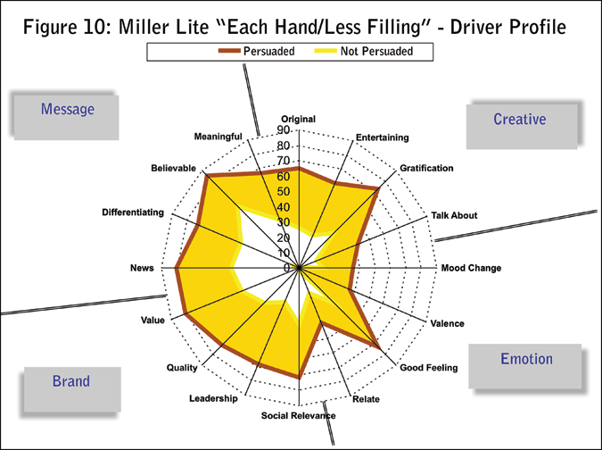 The processing map for the Miller Lite ad is very different, as seen in Figure 10. The verbal Message quadrant is where the action is for Miller Lite. This is a classic message-oriented ad that delivers believable and differentiating new news about the brand. Can this more cognitive approach make that important emotional connection as well? Yes it can but obviously in a different way. Good thoughts can evoke an emotional response just as compelling visual and situational cues can. There’s more than one way to make that emotional connection. On the Miller map we can see that those who were persuaded by the ad were left with an overall “good feeling” from watching the ad. Why? Perhaps because they learned something valuable about the brand that is relevant to their personal lives - lower carbs in a great-tasting beer.