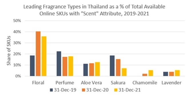 While scent as an attribute has remained popular in Thailand over the years, the different types of scents can change due to evolving consumer preferences or by way of brand innovation and new product development. The chart above indicates the top scent types and how they have changed in proportion over a three-year time period based on online SKU availability.