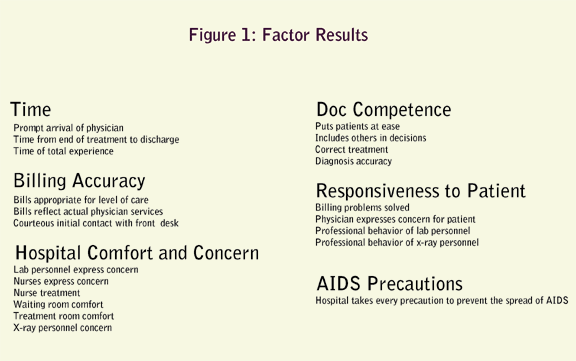 The six-factor solution included Hospital Comfort and Concern, Physician Competence, Responsiveness to Patients, Billing Accuracy and Appropriateness, Time and AIDS Precautions (see Figure 1). While these do not perfectly replicate factors identified in marketing and health care literature, similarities are evident.