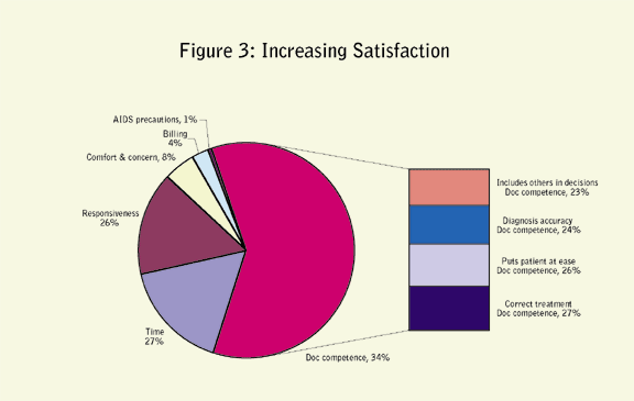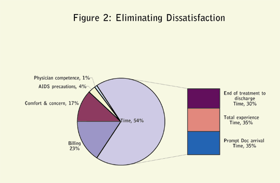Developing action plans aimed solely at minimizing dissatisfaction will not result in the intense loyalty and positive word-of-mouth that are characteristics of organizational excellence. Therefore, a second discriminant analysis of expectations met/exceeded was performed to understand the antecedents of an overall state where patient expectations were exceeded. As Figure 3 shows, this resulted from, in descending order of importance, outstanding performance in these factors: Physician Competence (34 percent), Time (27 percent), Responsiveness to Patient (26 percent), Hospital Comfort & Concern (8 percent), Billing Accuracy and Appropriateness (4 percent) and AIDS Prevention (1 percent).