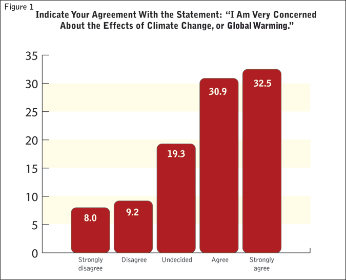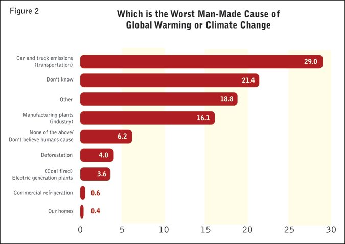 Figure 2 shows the responses to the question, “Which is the worst man-made cause of global warming or climate change?” Less than 4 percent of consumers name coal-fired electricity production as the biggest man-made contributor to climate issues. Nearly 30 percent of consumers think car and truck emissions present the worst man-made cause of global warming/climate change.