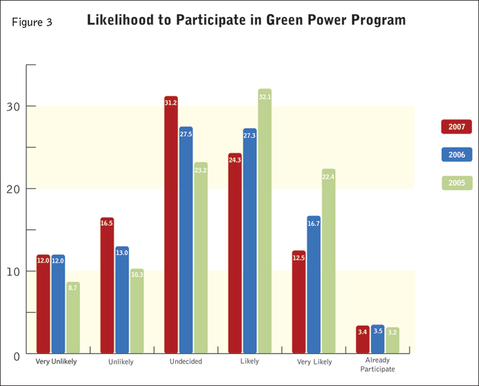 According to the report, survey participants have been very likely over the past three years to say they will participate in green power, but the apparent show of support has not been particularly predictive of actual behavior.