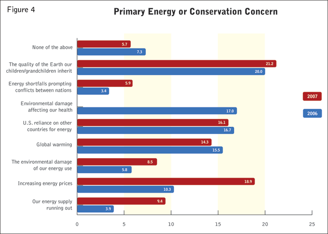 However, “increasing energy prices” dropped from number two to fifth place and a newly introduced concern, “environmental problems damaging our health and/or the health of our families” is now tied for second with “U.S. reliance on other countries for energy.” These results are all shown with percentage responses in Figure 4.