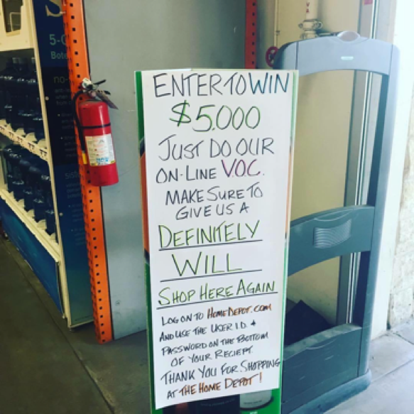 Evidence of this is not hard to find. For example, a home improvement store in Texas is encouraging customers to complete a customer survey in a certain way by promising winning big by providing top box (see photo below, courtesy of Todd Blickenstaff).
