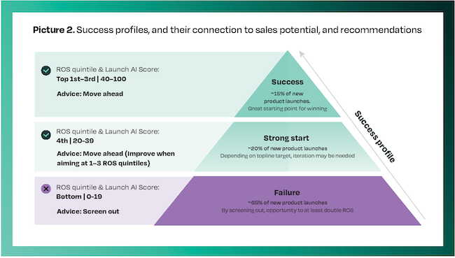 Success Profile and Launch AI Score: Success Profiles help to screen in and out concepts while Launch AI Score (0-100) helps to rank them. Concepts are classified, based on their predicted weighted rate of sale (ROS):