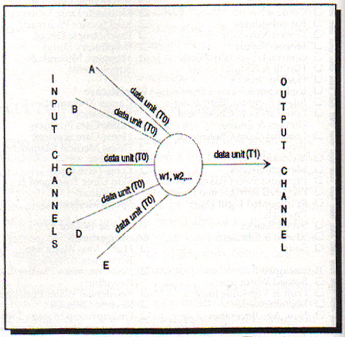 Before getting into the details of the learning algorithms, let’s review briefly the general terminology of neural networks. A neural network consists of equal basic processing units - neurons. All neurons of a network operate in parallel. They process the data in units meaningful for the application. Being equal it also takes them the same time to process the same amount of data - a processing cycle. The neurons are connected to the outside world and to each other by data channels. Each channel carries one data unit for each processing cycle. A neuron has many input channels and a single output channel. The neuron calculates its reaction to the data units in its input channels and forwards it into the output channel in one processing cycle. The internal state of the neuron is defined with the values of its state variables. They are involved in the calculation of output. The neuron on figure 1 at the moment T0 has data in its input channels A, B, C, D and E and it puts out the reaction at T1 - a processing cycle later.