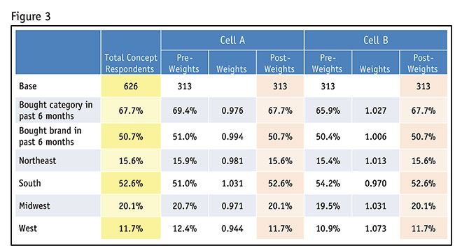Once the decision has been made to go with a monadic design, it is important to ensure that the design is implemented properly. While the first step is to randomly assign respondents to two or more cells, we cannot rely on randomization alone to ensure that our cells are comparable. Sample-balancing is the art and science of creating and applying weights to respondents so that any conclusions being drawn from the test are based on the concepts themselves and not the underlying sample composition of the cells.