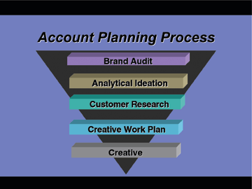 The accompanying chart illustrates one model for the account planning process. In this model, planning begins with an analysis of the marketplace, the competition, a brand’s strengths and weaknesses, pertinent demographics, psychographics and cultural trends. “Analytical Ideation” refers to a method that borrows from linguistics, psychology, anthropology, traditional ideation, and classic marketing to provide a springboard for new strategies and research questions. Customer research may include qualitative and/or quantitative inquires. The “Creative Work Plan” is the blueprint for creative development; it incorporates all of the learning and insights generated thus far. “Creative Development” gives life to the analytical work upon which it is based. An evaluative phase of strategies and creative work is often built into the account planning process at critical junctures.