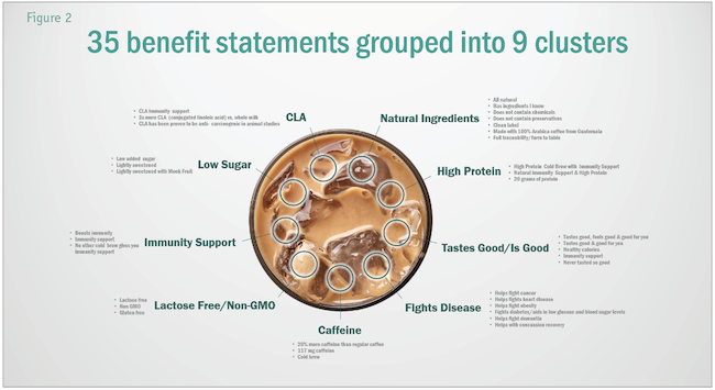 We started with about 120 benefits that the client wanted to include in our research. We narrowed them down to 35 statements that could be logically grouped into nine clusters (Figure 2). The package is a brand’s prominent and most important advertising tool so every word and graphic matters. In Spruce’s case there were way too many to put on a package let alone promote in any marketing communications.