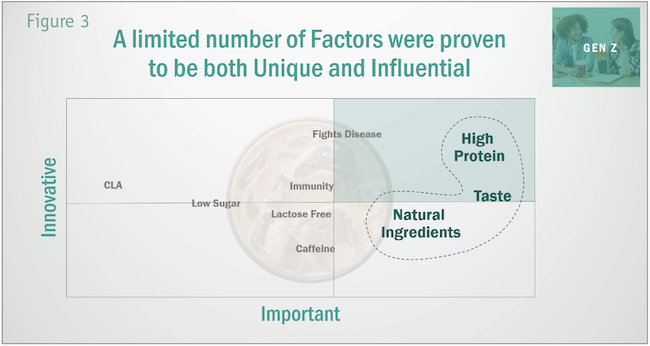 Consumers’ cognitive ability to understand and rationalize a product’s benefits is often limited to no more than two or three KPDs or key selling points. With the goal of maximizing Spruce’s benefit-messaging, the results were clear to us: the 35 items clustered into nine key areas that made logical sense to the target audience. The upper-right quadrant of the map (Figure 3) represents the items that were most important and most innovative: protein, taste and natural ingredients. Taste/flavor is always paramount in the beverage segment and therefore adding protein and natural ingredients as the top-two ranking factors gave the client direction and very actionable next steps.