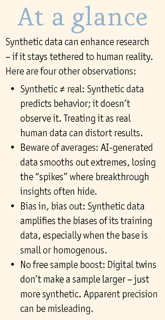 No statistical magic: Digital twins don’t increase the real sample size. Thirty real participants remain 30 participants, even if the model based on them generates 170 more. The answers may seem more precise but they are no more generalizable.