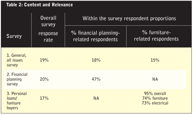 The first survey was a general satisfaction, product awareness and product use survey, designed to provide answers across a wide range of areas. The second concentrated on financial planning use and intention, and the third survey sought personal loan potential by identifying recent furniture and electrical appliance purchase behavior. Each survey invitation had an e-mail subject line seen as appropriate. These were: