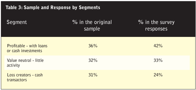 As Table 3 shows, the proportion of responses from each segment noticeably differed. Almost twice as many of those in the “most value” segment (because of their large loans or cash investments) responded than those in the loss-creators segment (who just used the financial institution to get cash). The segments were constructed by the financial institution and not by commonalities of the sample except in their types of interaction with the financial institution.