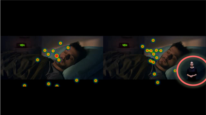 Meanwhile, with the eye-tracking heat map we measured the point of gaze (where on the screen the audience’s focus is) and tracked the motion of the eyes when watching the ad with the sign-language narrator and without.