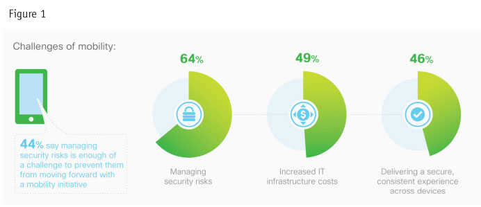 Despite the evidence that many organizations are actively increasing their employee mobility solutions, these initiatives do not come without their challenges. By a wide margin, as shown in Figure 1, the chief concern of IT leaders across the country is managing security risks across mobile devices (64 percent). In fact, 44 percent of organizations say managing security risks is enough of a challenge to prevent them from moving forward with a mobility initiative. The other most-cited challenges of employee mobility include increased IT infrastructure costs (49 percent) and challenges associated with delivering a secure, consistent experience across devices (46 per-cent).