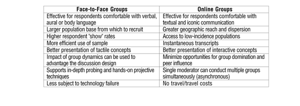 Face-to-face research offers some distinct advantages over online methods. First, the nature of face-to-face discussion provides an effective forum for respondents who best communicate through speaking, listening and reacting to others, or body language. Traditional groups allow for the presentation of tactile, three-dimensional concepts, and support the use of hands-on projective techniques. In addition, while still permitting interactivity through demo CDs and live Web connections in the focus group room, traditional groups limit the potential for technology failure.