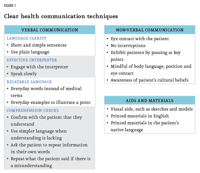 To aid our mission to bring increased awareness of health literacy among HCPs, we created a summary of clear health communication techniques that physicians and nurses can use both inside and outside of the ER. We came up with three categories to organize these techniques into: verbal, nonverbal and aids and materials (Figure 1). Our team feels passionately about a few of these techniques, including using plain language when explaining things to patients and using everyday examples to illustrate a medical term.