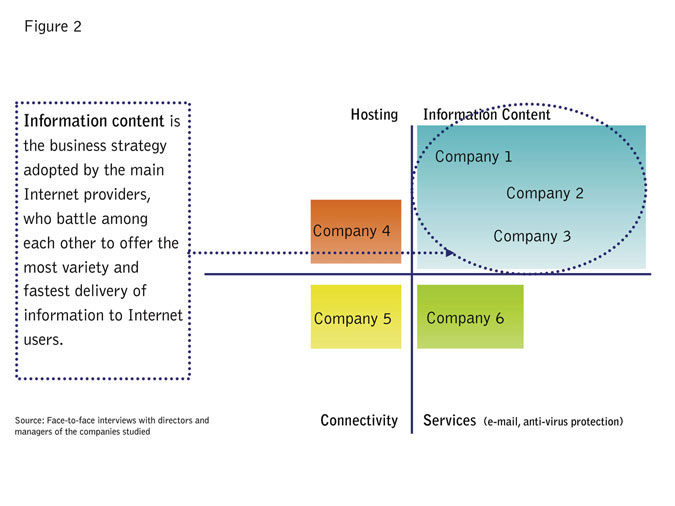 According to the key people interviewed for the research, the information content to be offered by each Internet provider’s Web portal is the business anchor for the companies, to which a great part of their effort is directed (Figure 2). They are also focused on the expansion of national coverage as a strategy for competitive advantage.