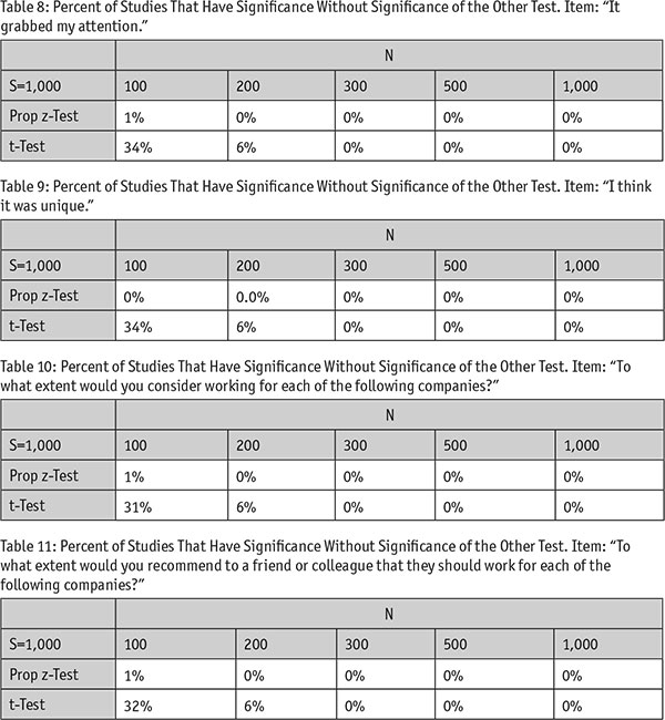 When it comes to smaller sample sizes, such as when N = 100, top-box scoring and Likert-scale scoring yield completely different results. For example, out of 1,000 simulations, a t-test finds 538 of the studies to have a significant difference. Conversely, when using top-box scoring, only 125 out of the 1,000 studies were found to have significant differences. In total, only 14 studies (1.4 percent of total simulated studies) found overlap between the two tests. If only 1.4 percent of 1,000 studies have overlap between the two tests, it seems fair to assume that the tests perform very differently.