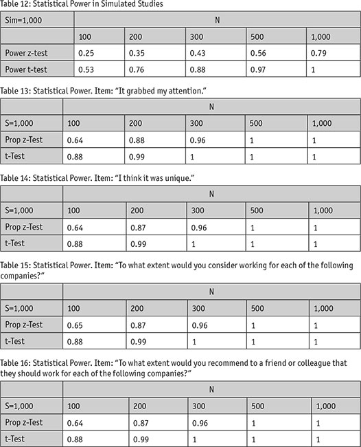 Loss of power: Every statistical test is like a market researcher’s microscope. You need a more powerful microscope to see smaller things and a less powerful one when looking for bigger things. This analogy holds in statistics – you need more power to detect small differences and less power if you’re looking at bigger differences. Power is a way of expressing the probability that the researcher will find a significant difference that is real (as opposed to a false negative or not finding a statistical difference when there really is one). Because ensuring that we have sufficient power is central to achieving a good study design, we recorded power in each of our simulated studies discussed above (see Table 12).