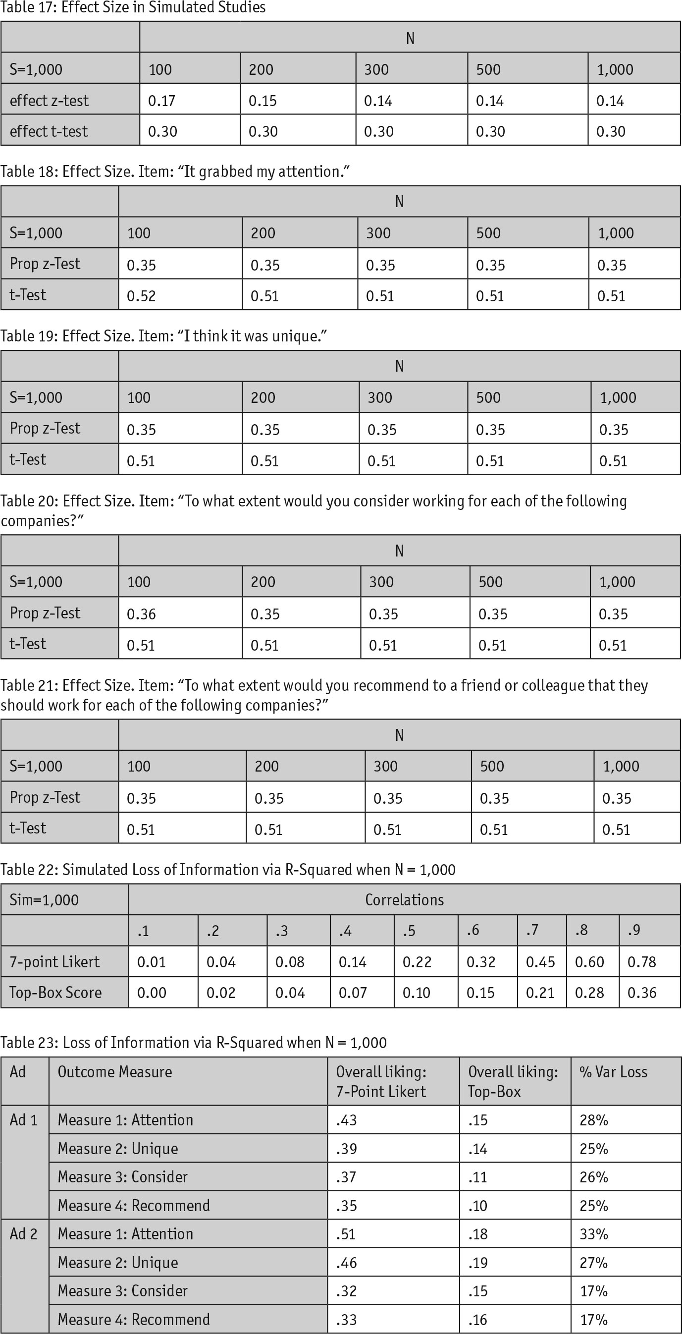 Loss of effect size: One of the reasons both tests yield different outcomes (i.e., presence or absence of a significant result) is because the effect we’re testing differs. Effect size is a statistical measure that assesses the practical significance (not statistical significance) of a test – namely, how big of an effect does one thing have on another. To see how effect size differed between top-box scoring and averages, we recorded the effect sizes from our simulation studies (see Table 17).