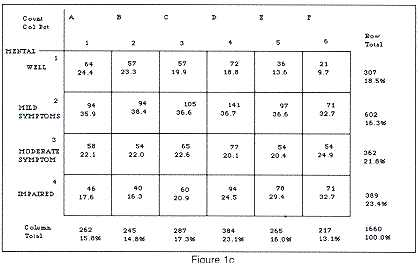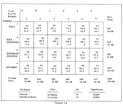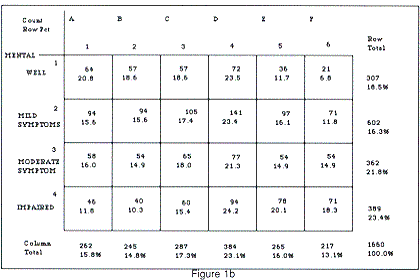 Let's look briefly at a traditional analysis of a famous two-way table: Srole's Midtown Manhattan data. These data were originally reported in 1962, and have been analyzed many times in different ways. Srole's data relates the mental health status of a respondent to his/her parents' socioeconomic status. Mental health status is one of four categories: "well," "mild symptoms," "moderate symptoms," and "impaired." Parental socioeconomic status is one of six categories ranging from "A" (high) to "F" (low). The sample size is 1660.