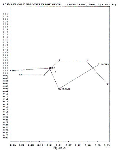 This plot tells pictorially what we learned through an examination of the row and column scores. Again, examination of this plot shows categories within the row variable and/or the column variable which are like and unlike. Moreover, you learn about the association between the variables, for the "well" category is juxtaposed near categories A and B of parental SES, the "impaired" category is juxtaposed near categories E and F of parental SES.
