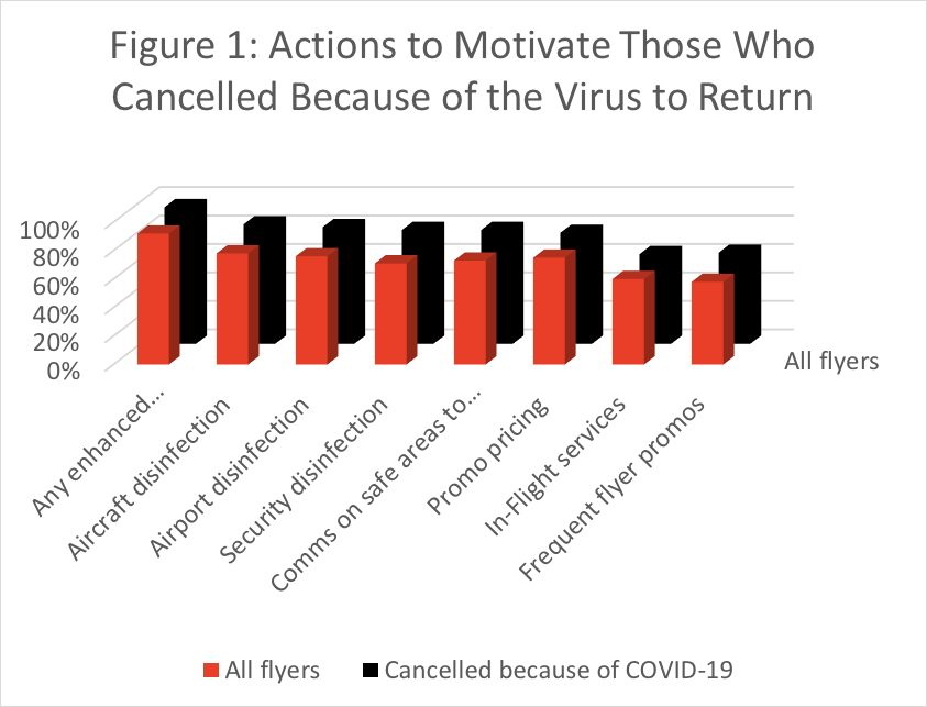 Enhanced sanitation is the clear priority. Figure 1 contains responses from consumers who had cancelled a flight and within that group those who specifically cancelled due to concerns about COVID-19 infection. The message this data contains is clear – of the multiple steps tested, the priority is to disinfect aircraft and airports to the highest standards, including TSA security screening areas. If those steps are taken then the great majority will return and additional steps will also resonate, such as advice on safe places to travel to and promotional pricing.