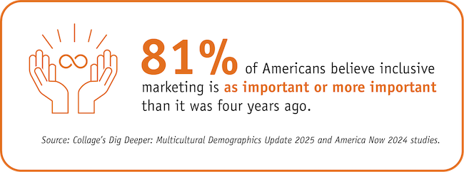 Brands, while they have a purpose and benefit-based value prop, are in the business of growing shareholder value. Inclusive marketing isn’t about social responsibility; it’s a business imperative. To thrive, brands must evolve with the changing consumer base. According to Collage’s “Dig Deeper: Multicultural Demographics Update 2025 and America Now 2024”*: