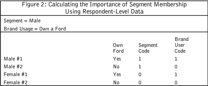 As can be seen in Figure 2, dummy-coding boils down to using 0s and 1s to code both segment membership and brand usage. Specifically, respondents are assigned a segment code of 1 if they belong to the segment under investigation (males), and 0 if they do not (females). Similarly, respondents are assigned a usage code of 1 if they own a brand (Ford) and 0 if they do not. Once all respondents have been coded in this manner, a correlation coefficient is computed. This coefficient is then squared to determine the amount of variance accounted for by segment membership with respect to brand usage.