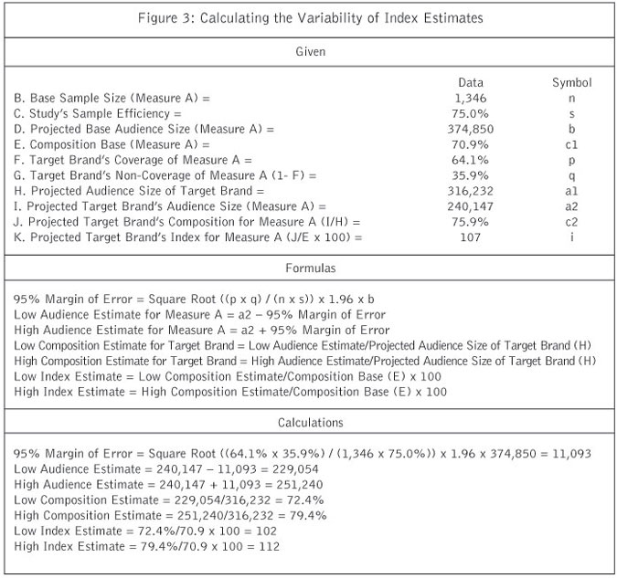 When examining any media metric, one should always evaluate the reliability of the estimate, especially when dealing with indices. The best way to do this is to calculate the 95-percent confidence limits surrounding the audience estimate for the given measure and then use the upper and lower estimates for the measure to calculate low and high index estimates. The specific steps, formulas and calculations needed to be followed to accomplish this goal are shown in Figure 3.