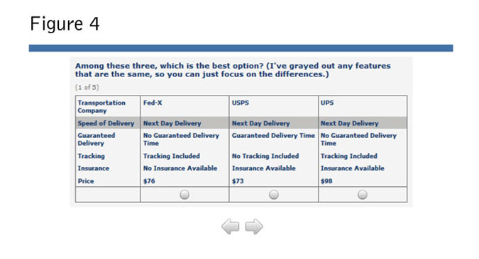 At this stage, ACBC allows the researcher to specify different price points for different levels of performance. So, if your company wants to charge a premium price for a premium service level, as did this transportation company, this can directly be tested in ACBC. For example, the transportation company in this case study wanted to test whether the market was willing to pay for faster delivery times.
