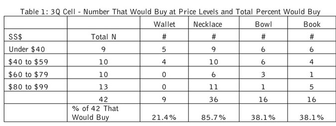 It is only in the 3Q cell that the overall level of interest can be examined (because question two was not asked in the other cell). Less than half were interested in the wallet, bowl or book (Table 1).