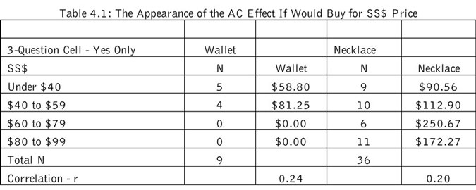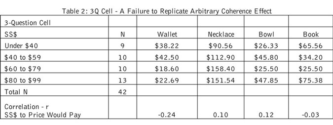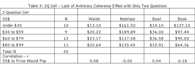 The arbitrary coherence effect was not replicated in the 3Q cell. There is either a mild effect or no effect of Social Security price on the price willing to pay for the necklace, bowl and book. For the wallet, the effect is, if anything, reversed - the higher the SSN$, the less people were willing to pay (Table 2).