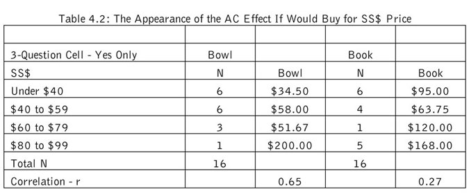 Since it is starting to appear as if the level of interest is a major factor influencing the arbitrary coherence effect, those who said they would buy for the SSN$ in the 3Q cell were examined separately. The base sizes are small, but the effect does show up under these conditions. The correlations were tested against zero, and only the bowl (0.65) is statistically significantly above zero at the 90 percent confidence level. Among those interested, the others trend in the right direction, at least (Tables 4.1 and 4.2).