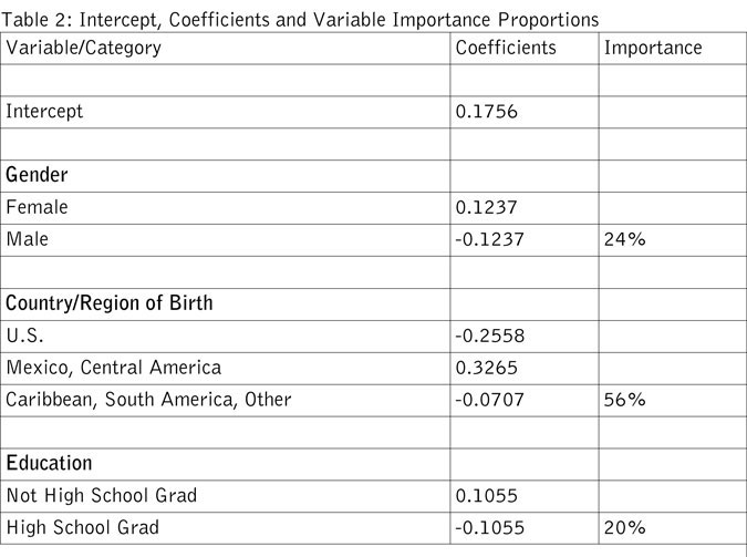 We should point out that some of the variables removed do appear to have some effect on top three-box usage. In particular, time-in-country stands out. On closer examination, however, much of the difference in the time-in-country variable comes from the difference in U.S.-born vs. foreign-born, an effect already reflected in the variable country/region of birth. In short, time-in-country does not add much new information once we take country/region of birth into consideration.