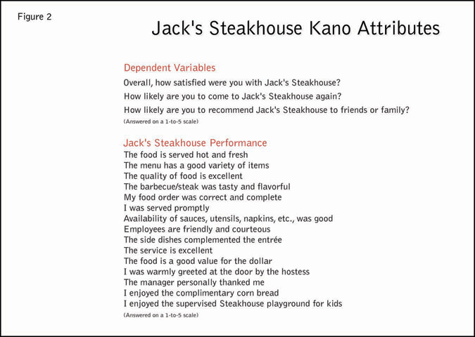 The easiest way to illustrate a direct application of the Kano process is to walk through a sample study. Let’s say Jack’s Steakhouse is a casual dining restaurant featuring barbecue and steakhouse cuisine, one of several chains owned by Colossal Restaurants.