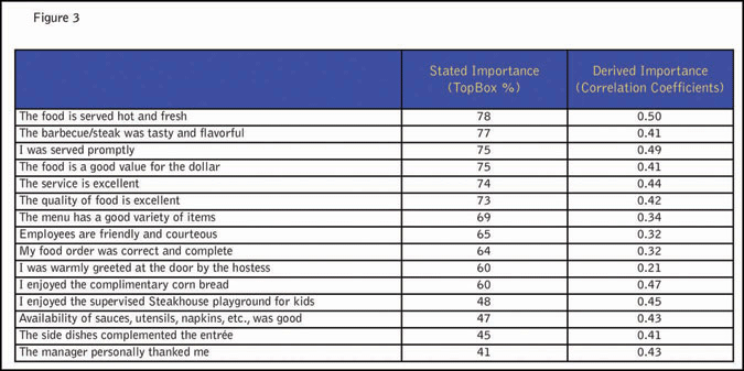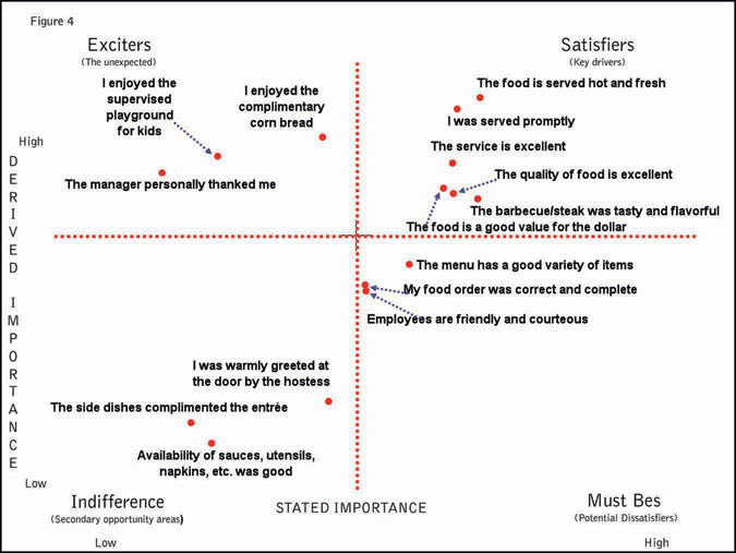 Kano’s initial procedure is to determine inferred importance by testing the effect of variable performance measurements against a dependent variable. The dependent variable could be one of several commonly measured, such as “overall satisfaction,” “likelihood to return to the establishment,” or “likelihood to recommend Jack’s Steakhouse to friends or family.”